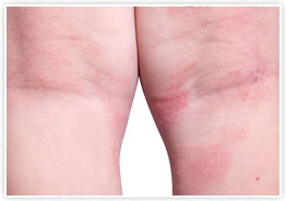 湿疹の一般的な症状は、急性期では皮膚に痒みをともなった赤い斑(紅斑)が現れ、さらには細かい水ぶくれ(小水疱)、ブツブツとした盛り上がり(丘疹)、膿の溜まった状態(膿疱)など、さまざまな症状が同時にまたは時期を違えて見られます。また、こうした症状を繰り返していると慢性化して、皮膚の厚みが増し、かたくなってきて、表面が粗くなります。